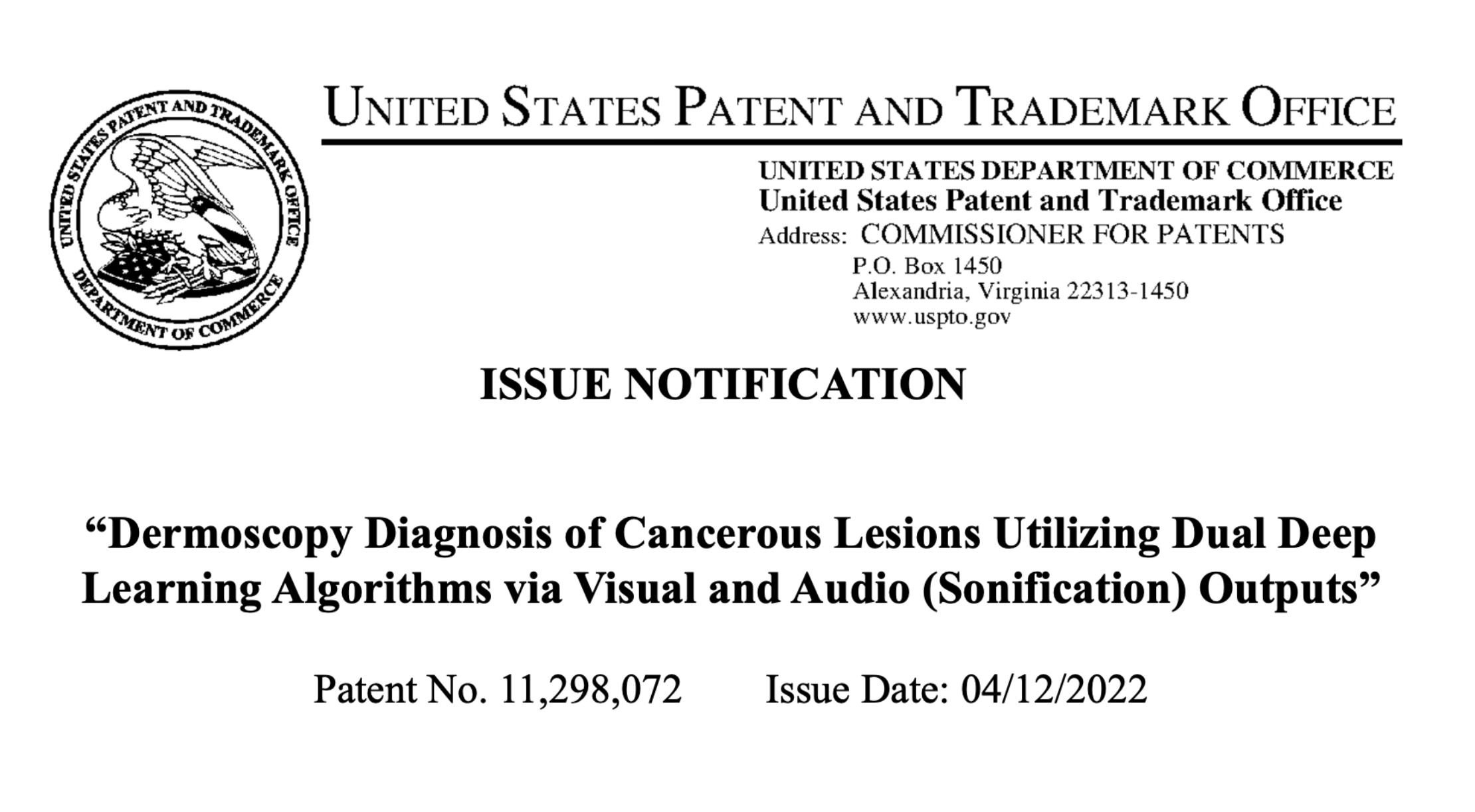 On April 12, 2022, the USPTO issued patent number 11,298,072, titled, “Dermoscopy Diagnosis of Cancerous Lesions Utilizing Dual Deep Learning Algorithms via Visual and Audio (Sonification) Outputs”. The patent covers Bostel’s novel approach to multimodal deep learning in diagnostic applications.